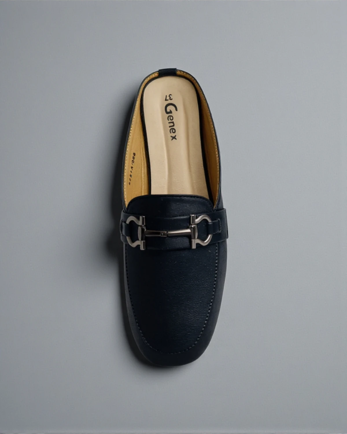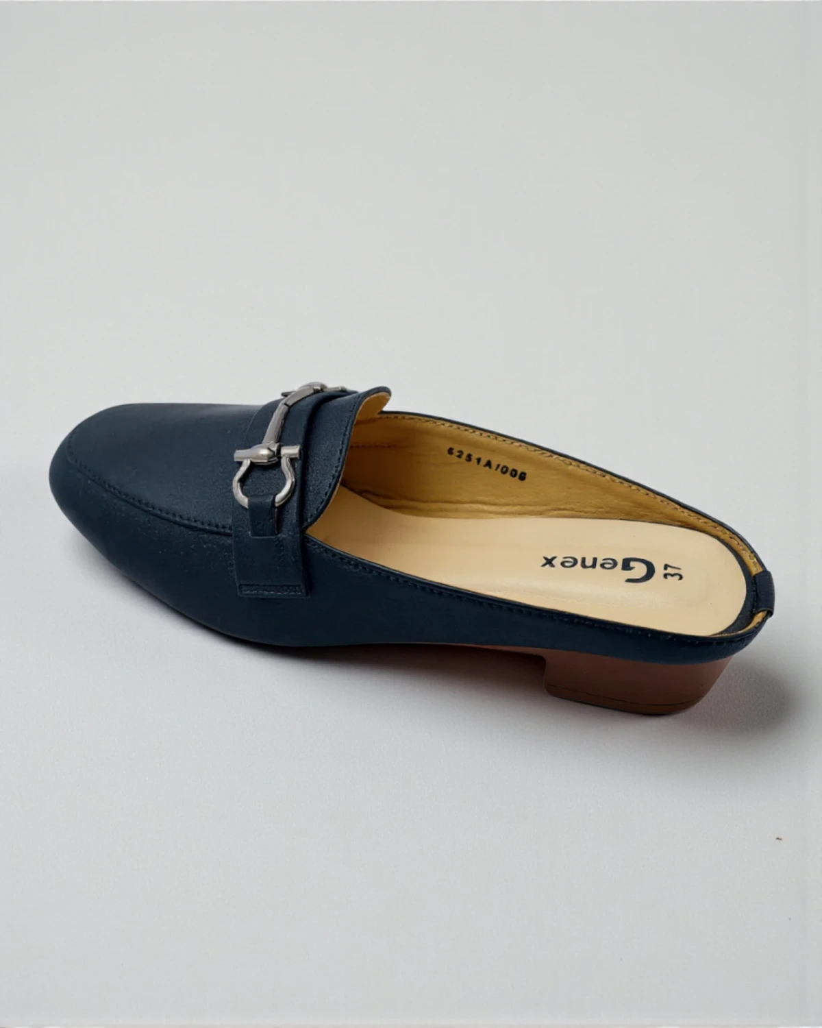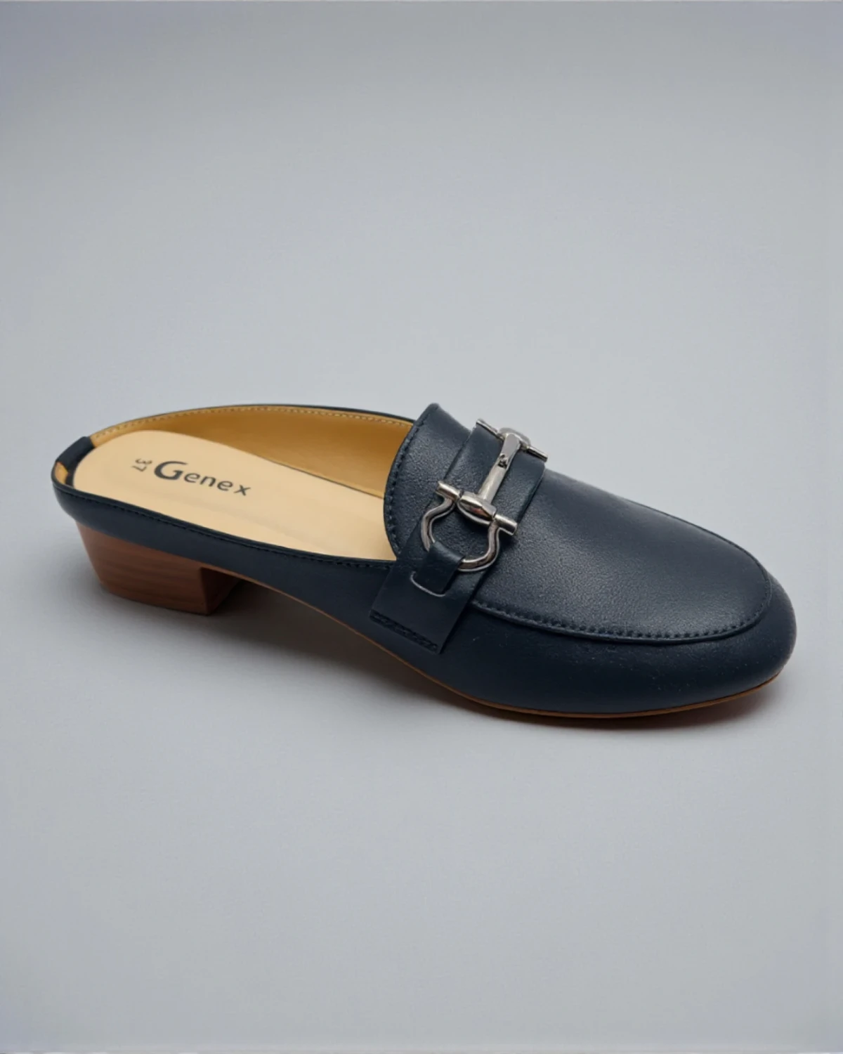 Step into effortless elegance with these Genex Navy Blue Horsebit Mules. Featuring a classic slip-on design with a chic metallic buckle accent and a comfortable low block heel, these shoes are the perfect blend of sophistication and daily comfort for office or casual wear.