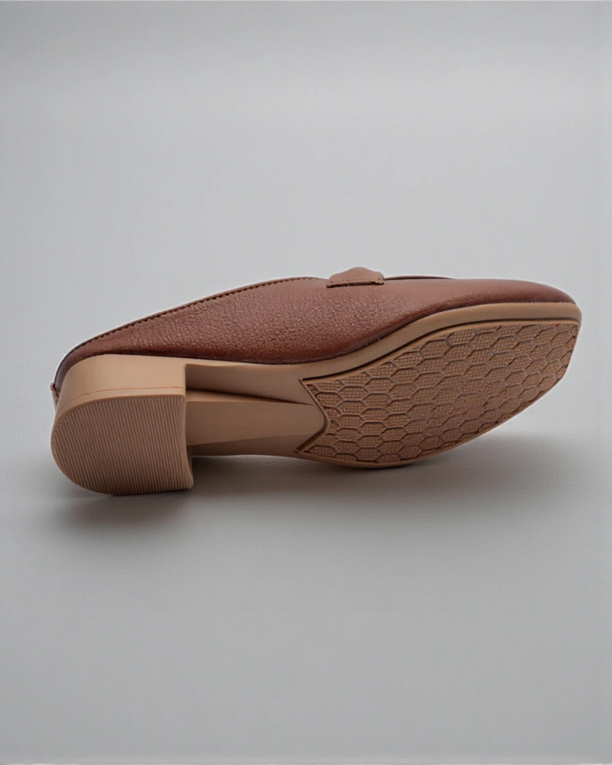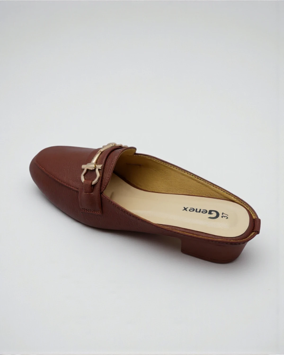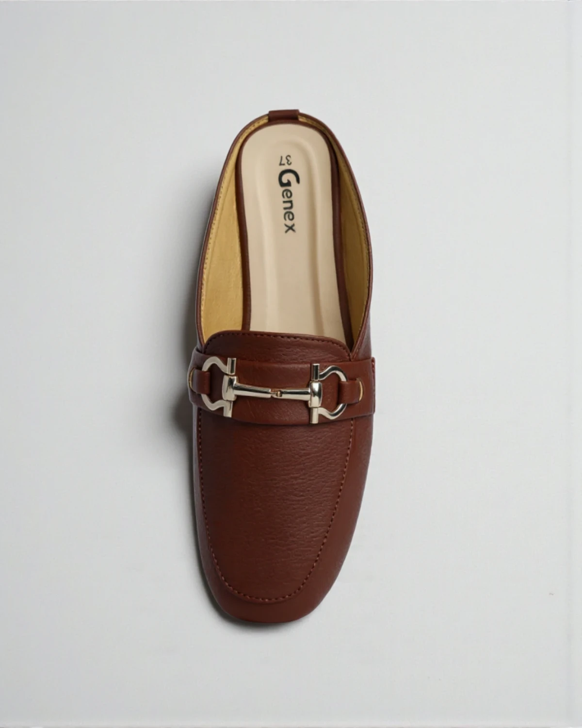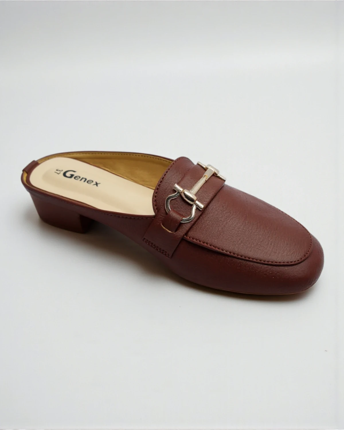Step into effortless elegance with these Genex Brown Horsebit Mules, featuring a rich textured finish and a classic gold-tone buckle. Designed for modern women, this slip-on loafer combines a comfortable low block heel with a sophisticated silhouette perfect for both office and casual wear.