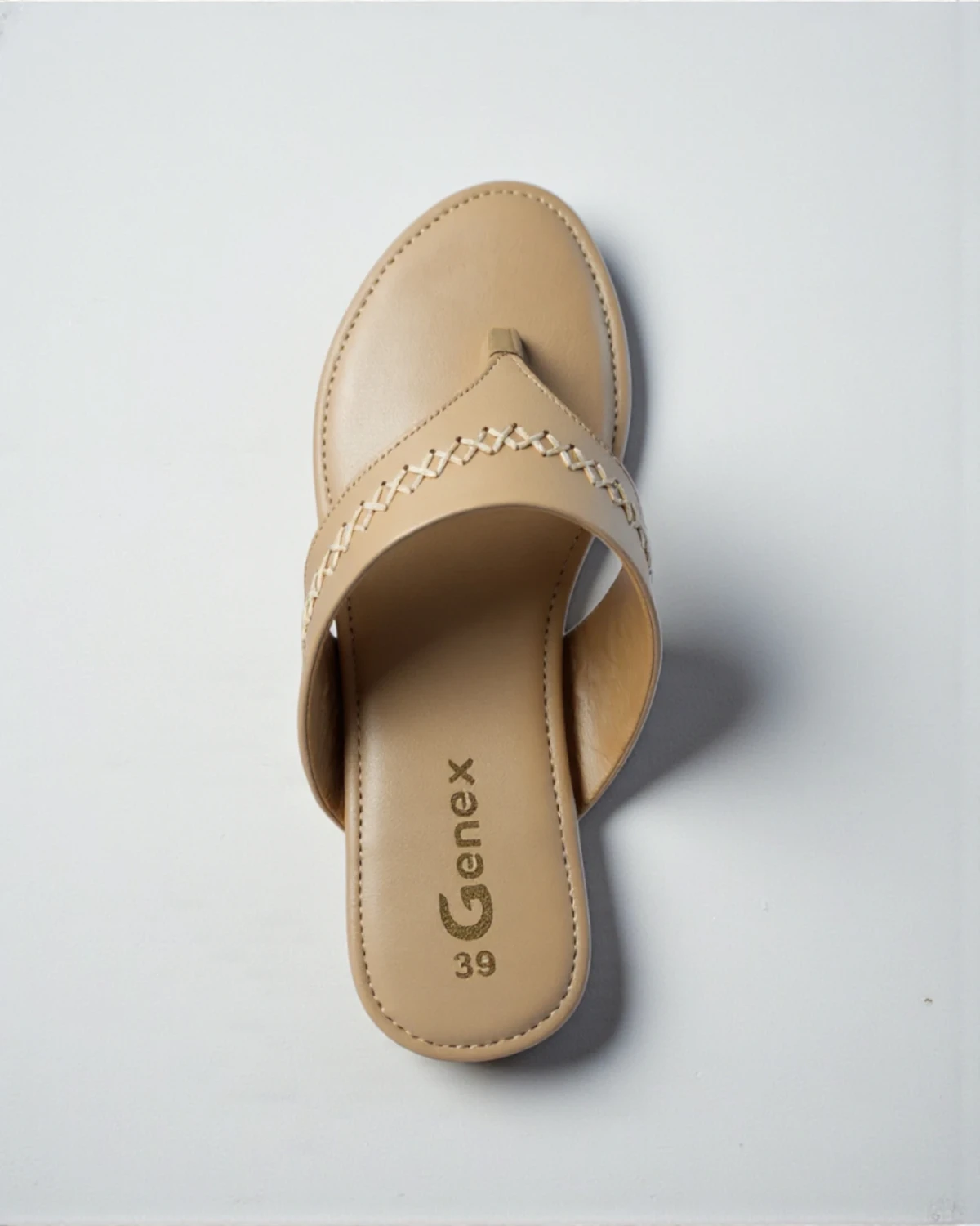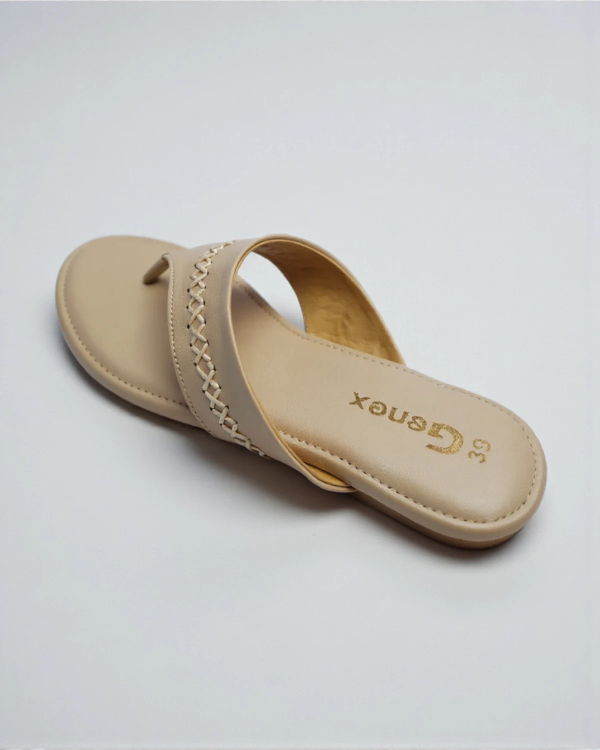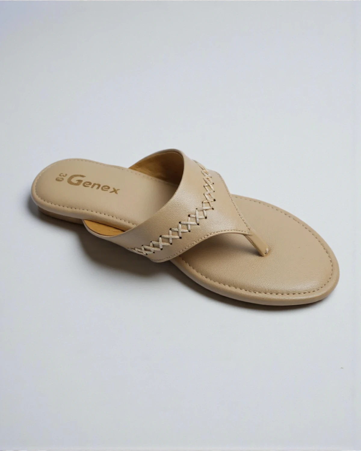 Step into effortless style and comfort with these elegant beige flat sandals by Genex. Featuring a chic crisscross stitched strap and a cushioned insole, these slip-ons are the perfect blend of casual fashion and all-day support for modern women.