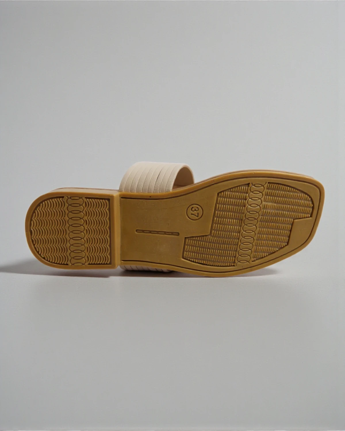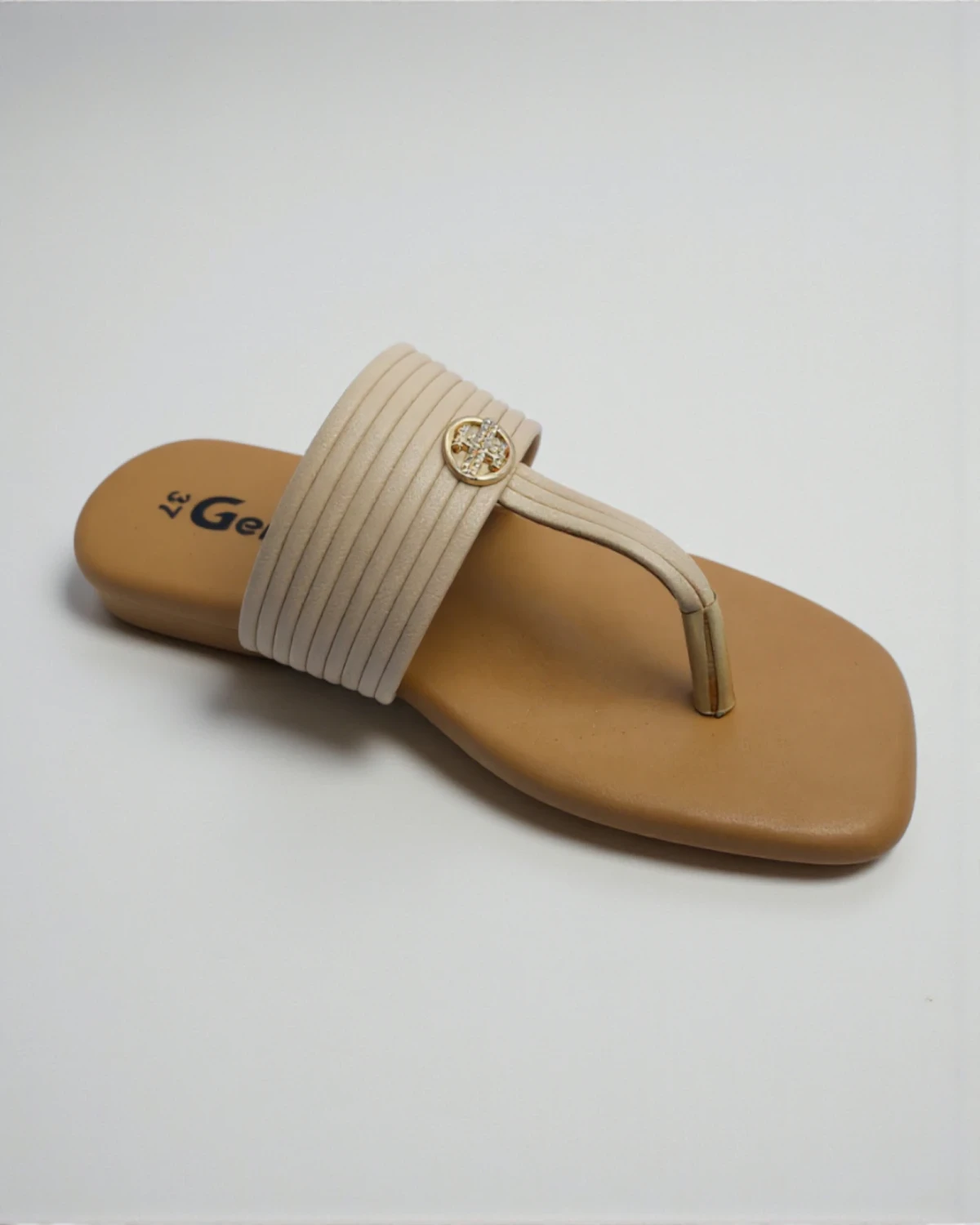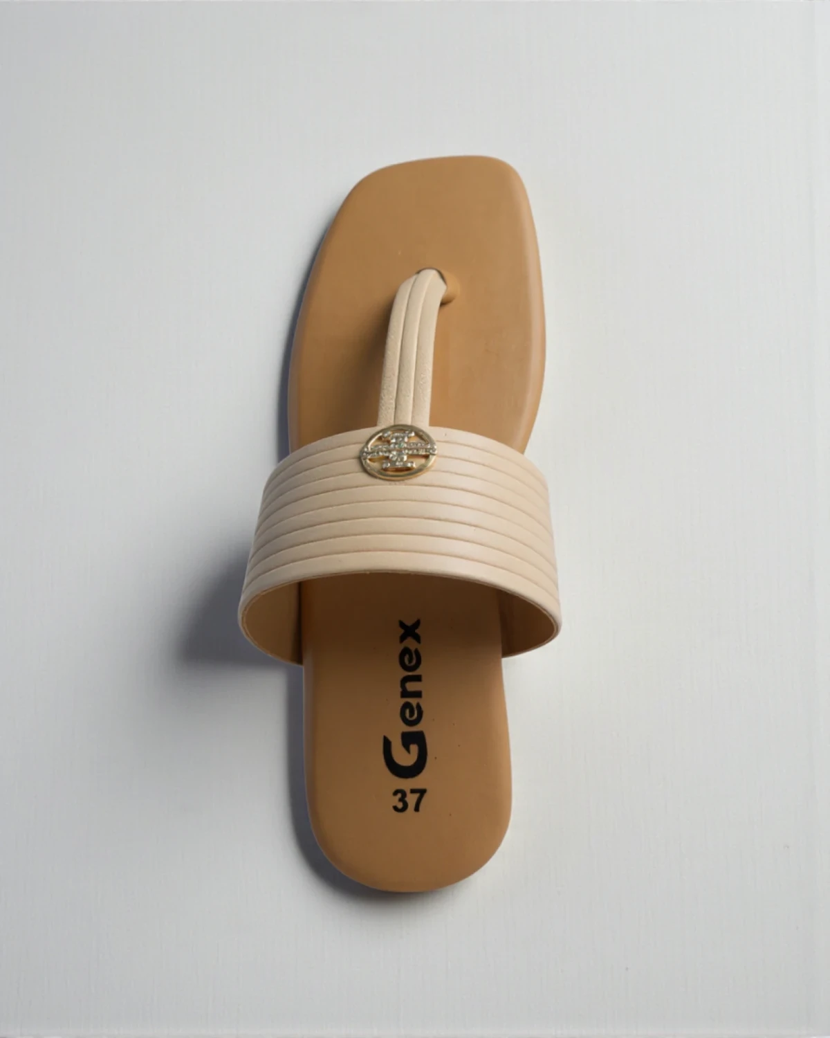 Step into effortless elegance with the Genex Beige Ribbed Toe-Loop Flat Sandal. Featuring a chic textured wide strap with a gold-tone accent and a comfortable cushioned insole, this slip-on is perfect for adding a touch of sophistication to your casual summer wardrobe.