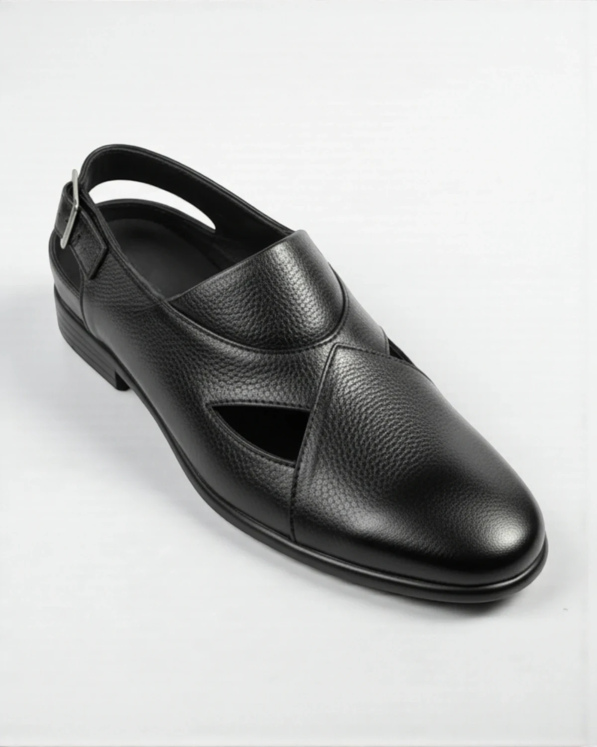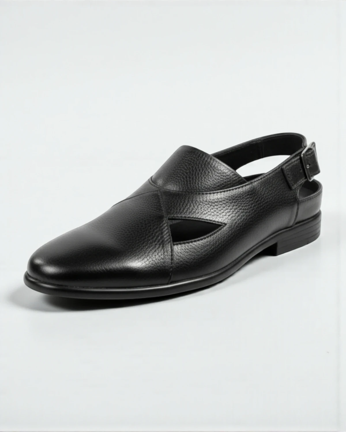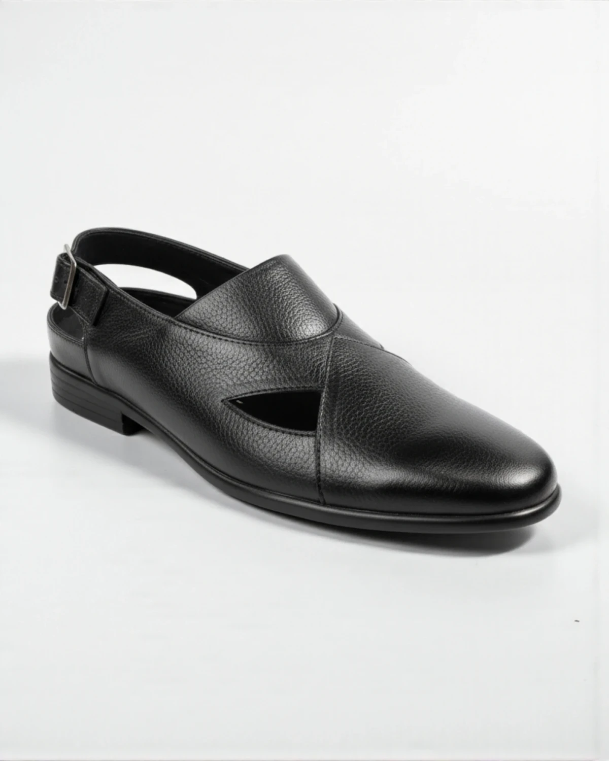Elegant black leather slingback dress shoe with a contemporary cut-out design, combining premium comfort and sophisticated style for formal events, business meetings, and smart-casual outings.
