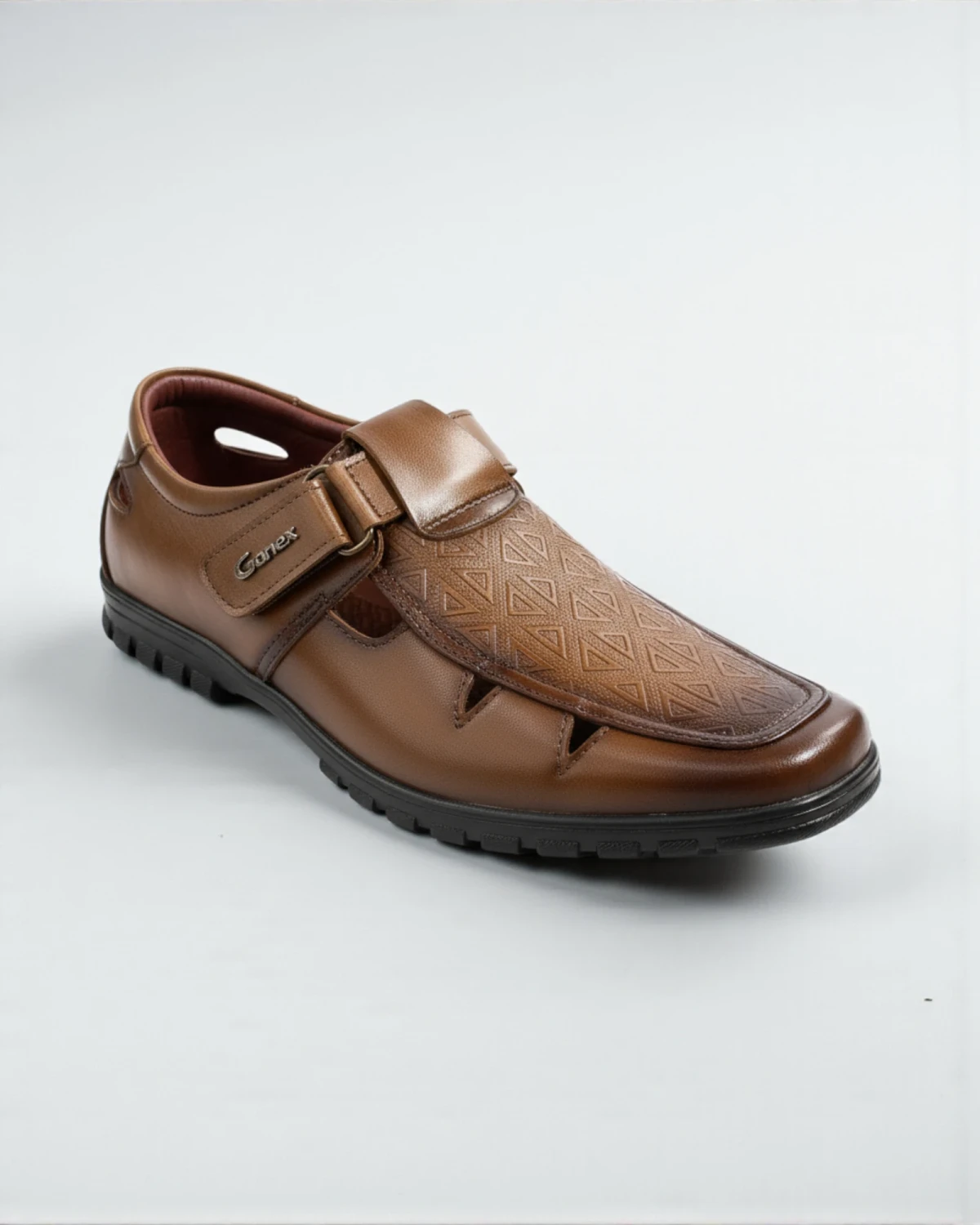 Genex Men's Premium Brown Leather Formal-Casual Shoe with Geometric Embossed Pattern, Ventilation Cut-Outs, and Adjustable Buckle Comfortable PU Sole for Daily Wear, Office, & Semi-Formal Occasions.