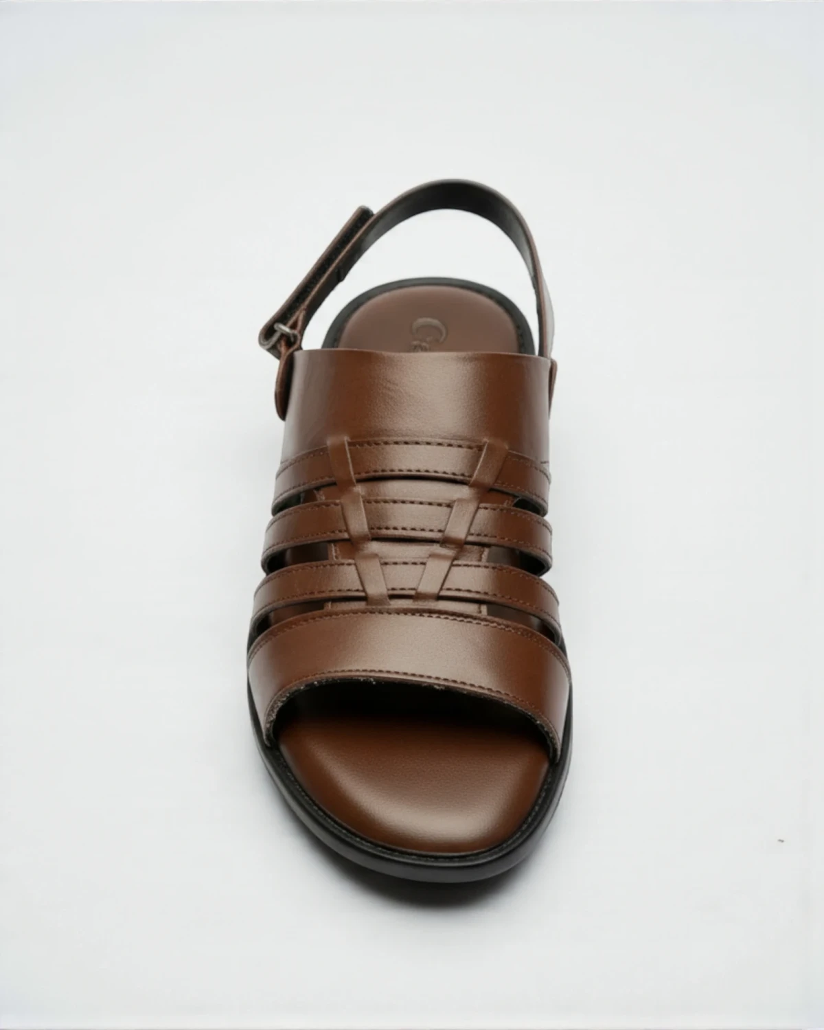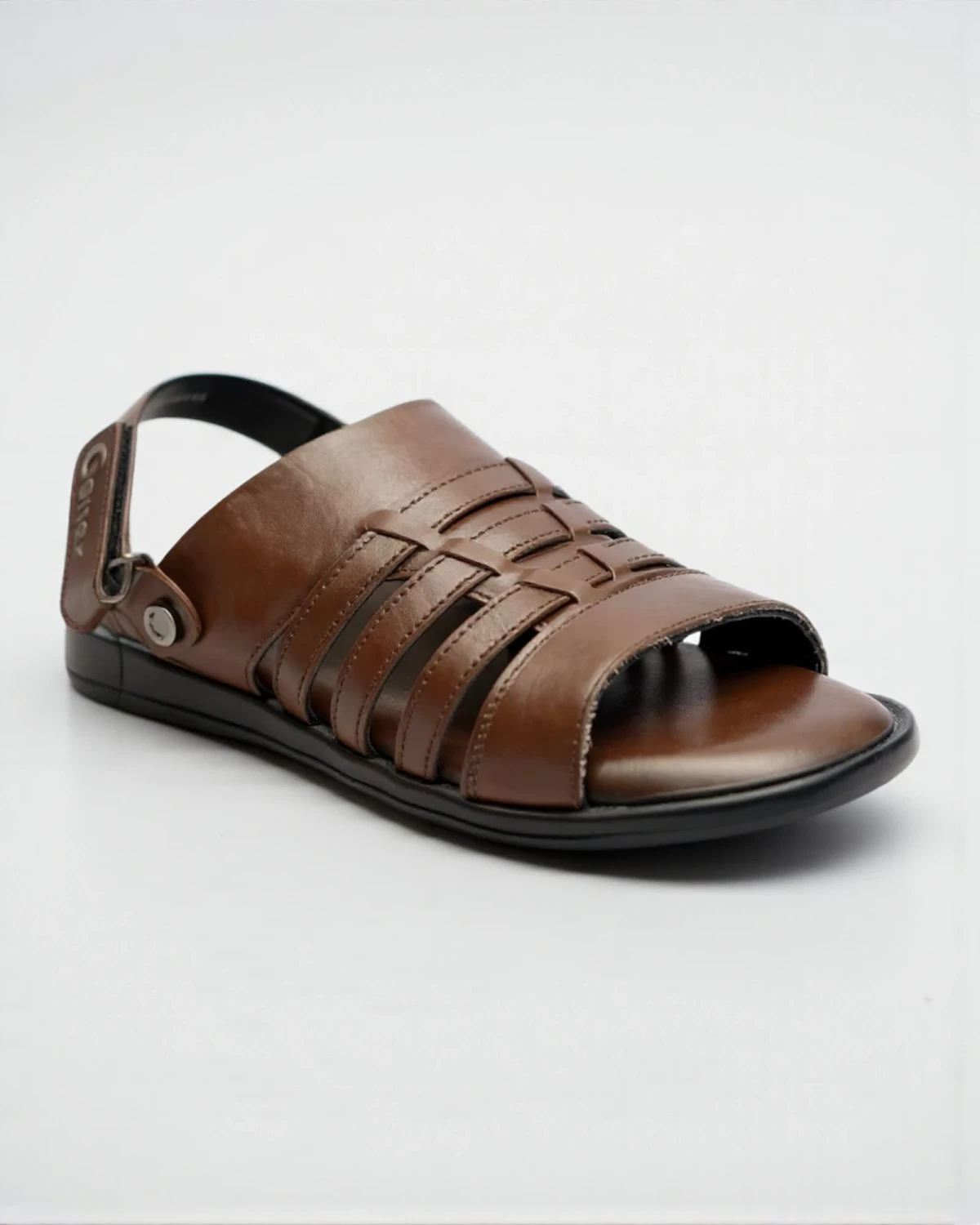 Men’s genuine leather slingback sandal in rich brown with breathable woven straps. Leather-cushioned footbed and flexible anti-slip rubber sole keep you comfortable for office-casual and everyday summer wear.