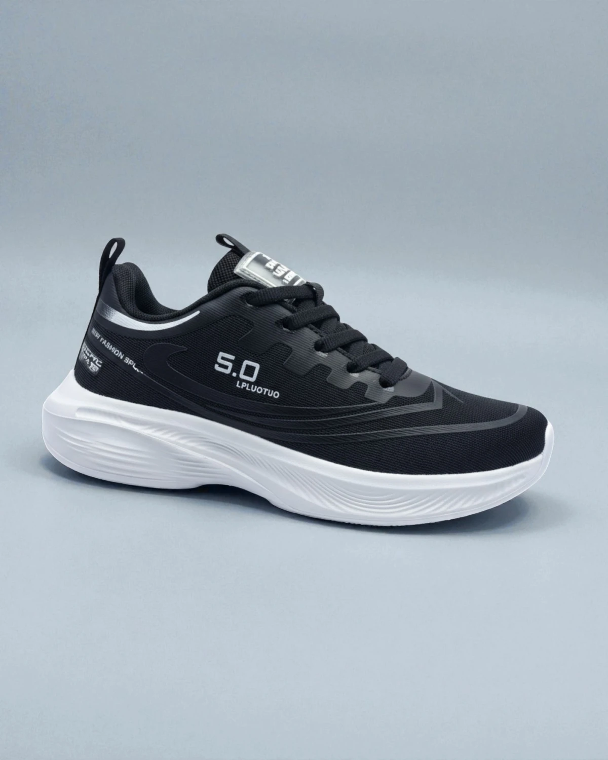A lightweight black athletic sneaker designed for everyday comfort, featuring a breathable upper, cushioned EVA outsole, and modern sporty detailing perfect for walking, running, and daily wear.